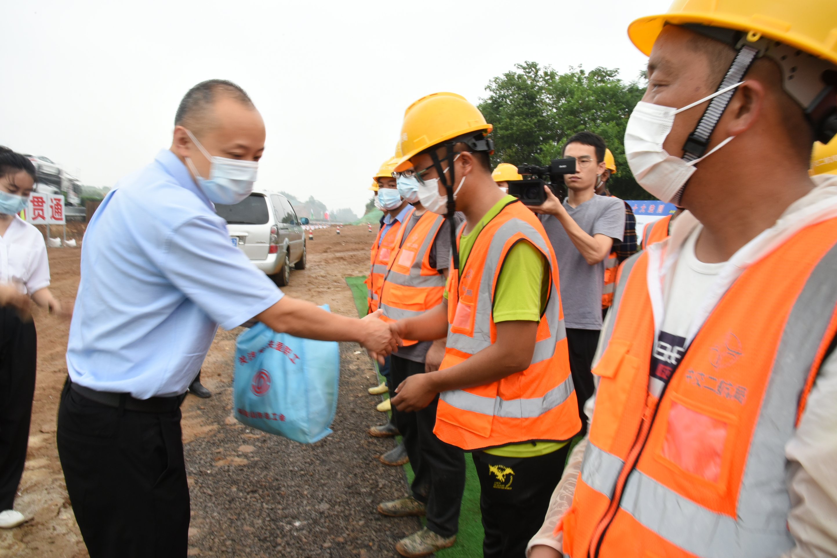 在施工现场,秦俊峰将慰问品送到一线工人手中,并与工人们亲切握手,向他们的辛勤贡献表示敬意。他强调在当前的大环境下,项目部要严格落实疫情防控举措,做好项目部的防暑降温工作,同时也叮嘱工人们要注意个人安全防护,在做到安全生产的同时,保障个人的生命安全、财产安全。慰问期间,项目负责人介绍了工程概况以及目前的施工进度。