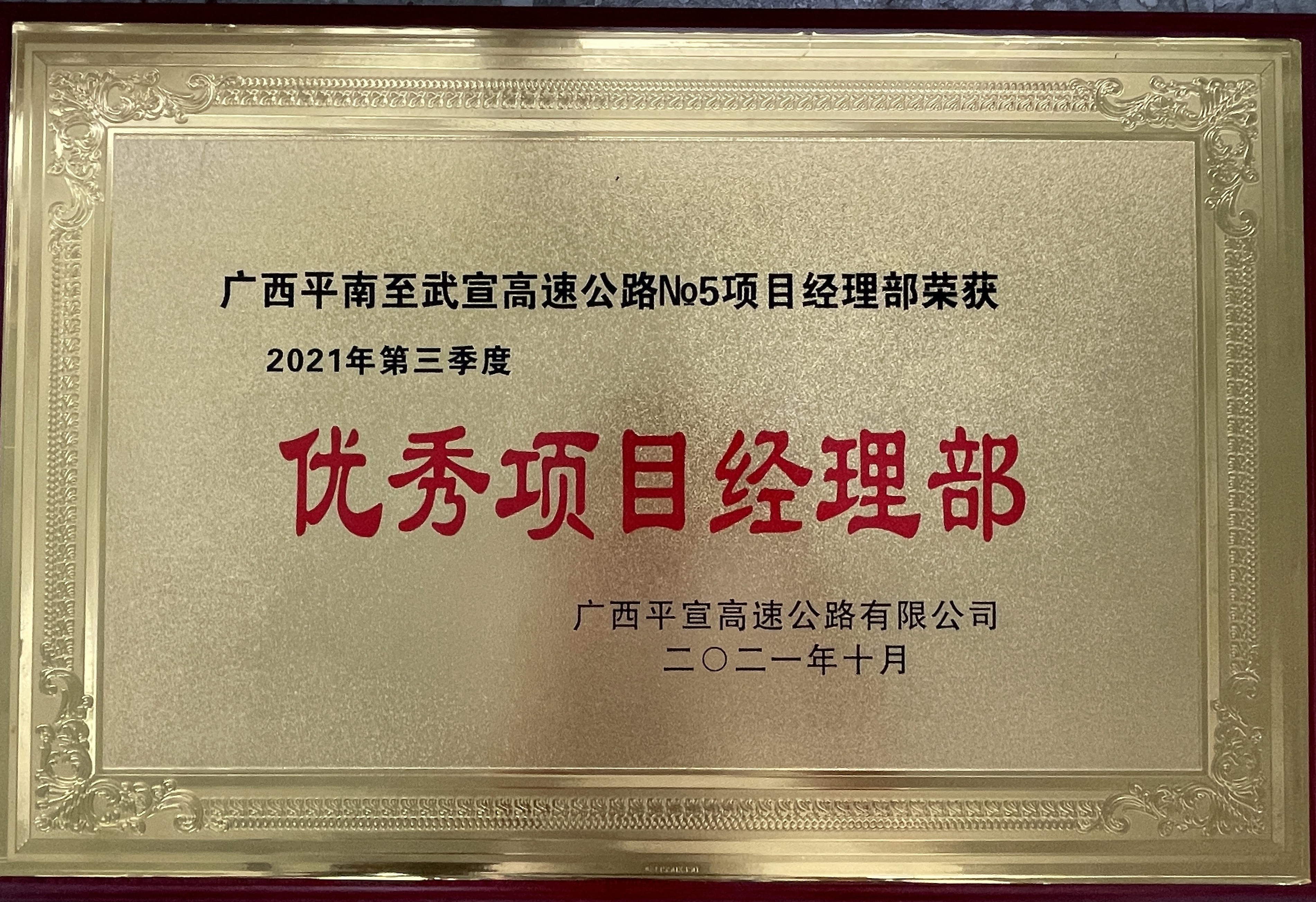 10月19日,从广西平宣高速公路有限公司2021年旱季施工动员大会传来喜讯,广西建设平武路№5标项目部荣获平武路三季度“优秀项目经理部”。