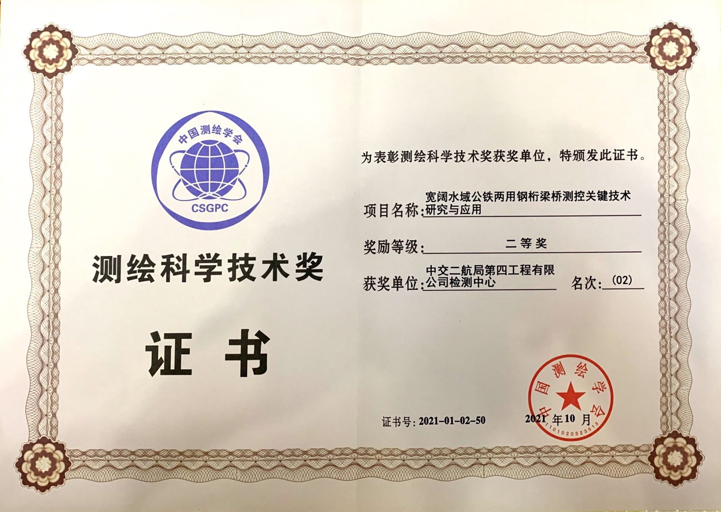 10月18日,中国测绘学会“2021年测绘科学技术奖”评选结果在青岛揭晓,公司检测中心研究课题“宽阔水域公铁两用钢桁梁桥测控关键技术研究与应用”荣获二等奖。
