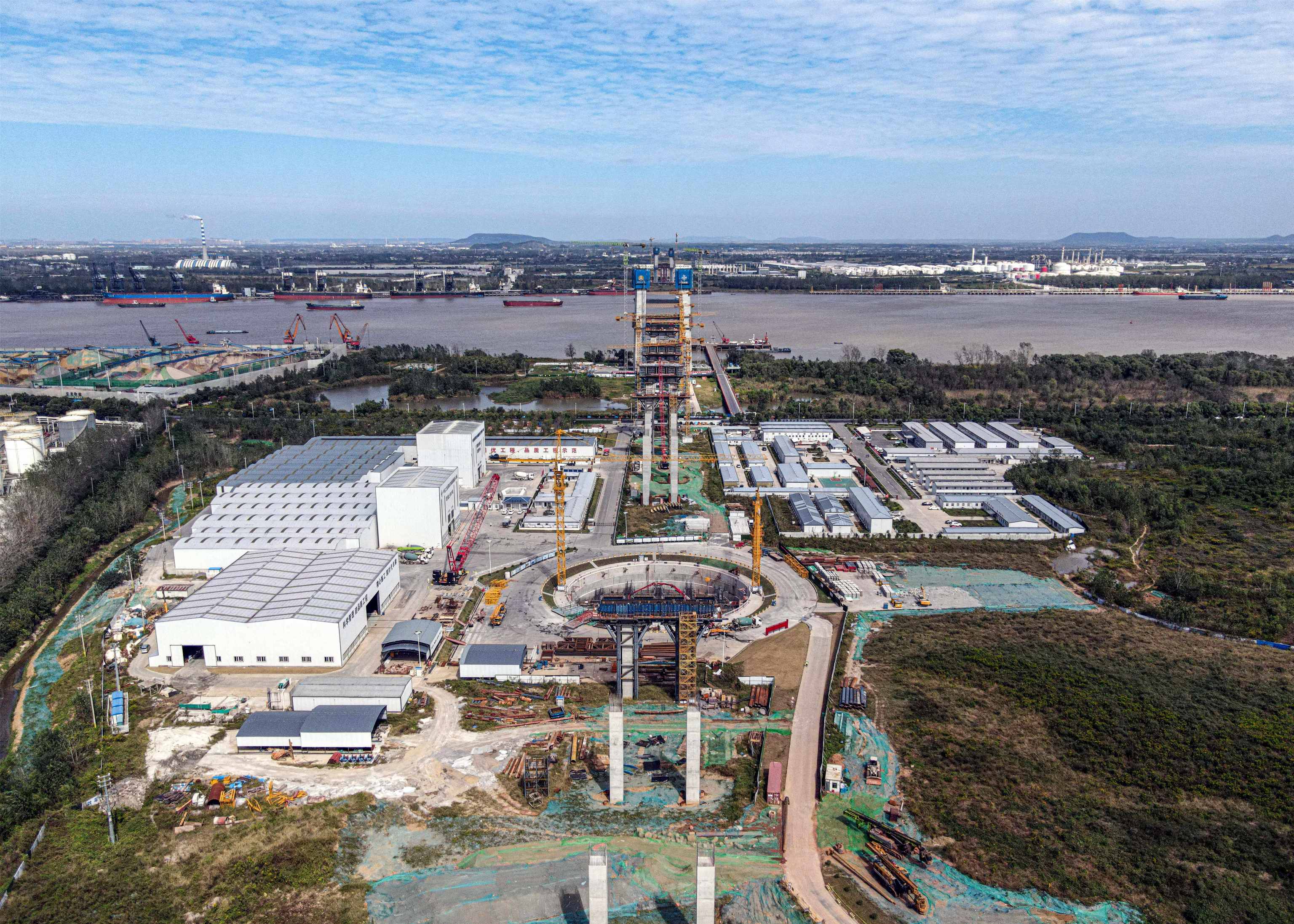 南锚碇采用地下连续墙结构,圆形地连墙直径63.5米,主要分为底板浇筑、填芯和隔仓施工三大工序。其中10米深底板浇筑为底部基础,完成后同时进行填芯和隔仓施工。其中填芯分为11层浇筑,单层浇筑3.6米;隔仓按垂直高度分为9层,单次浇筑4.5米,填芯和隔仓钢筋总用量达到1600吨,共计浇筑混凝土约12.6万方。在施工过程中,建设者克服了交叉施工、连续施工等困难,积极克服地质条件技术难度等因素,比原计划提前16天完成了南锚碇工期目标。