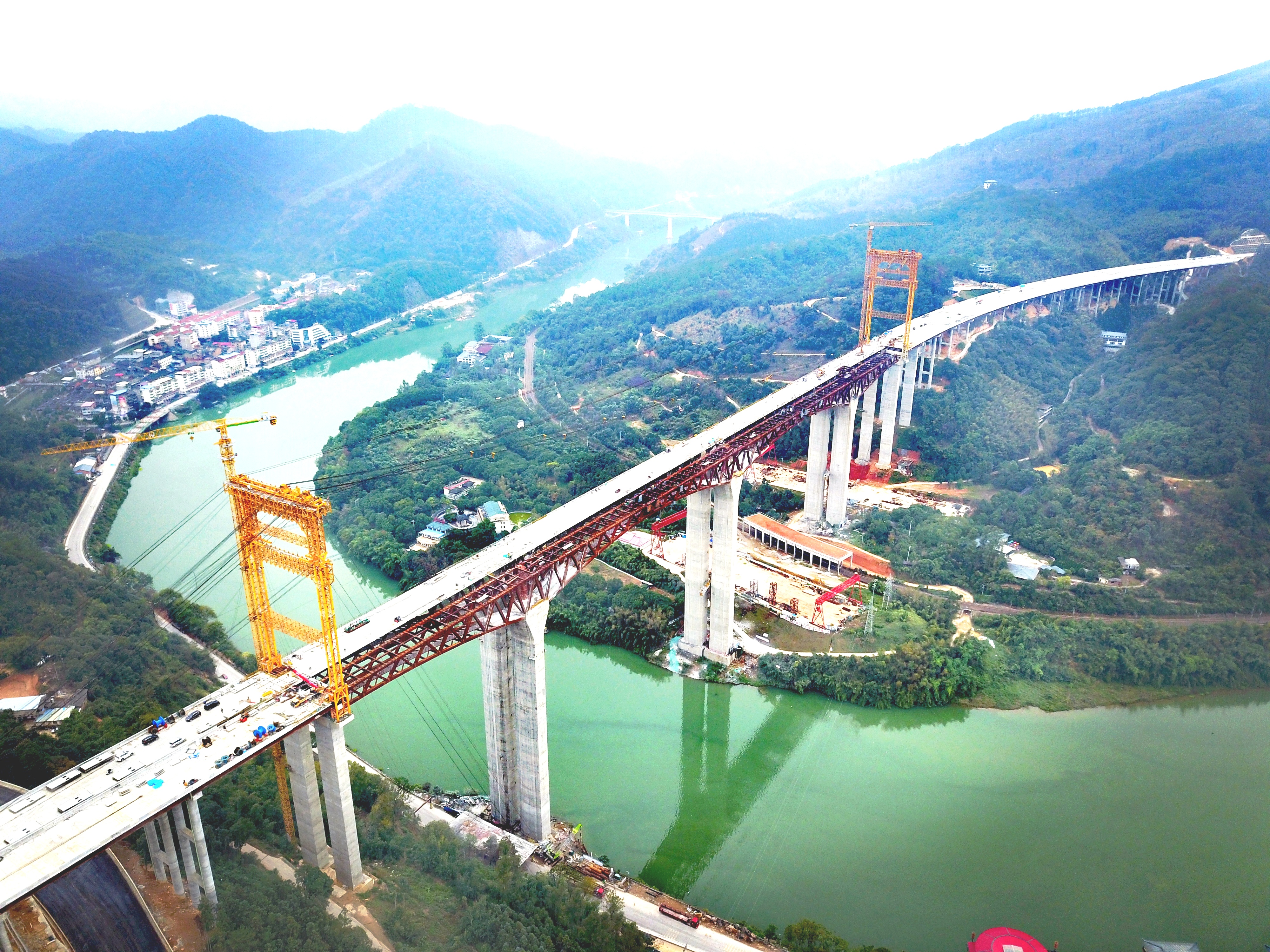 沙溪大桥位于福建省三明市莘口镇,全长1408米,宽33.5米,主桥墩高超110米,双向六车道,设计时速100公里。大桥横跨205国道、沙溪河、鹰厦铁路及月亮湾景区,主桥上部结构跨径组合为100 米+176米+176米+100米的钢桁组合连续钢构,采用缆索吊机安装施工,为目前国际上同类型桥梁最大跨径。作为莆炎高速项目的关键控制性工程之一,项目建成通车后,将进一步完善国家高速公路网络,对于进一步加快融入闽西南协同发展区步伐,做实做足“四篇文章”,完善三明高速公路路网,推动闽西北苏区老区经济社会发展具有重要意义。