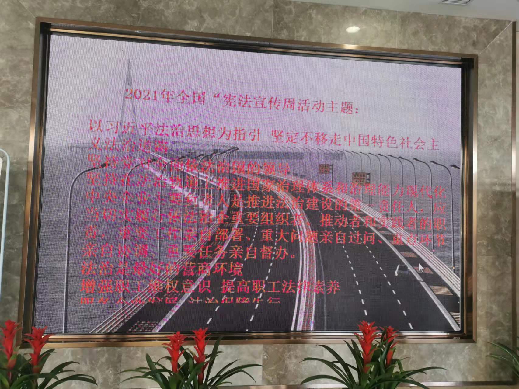 本次“宪法宣传周”活动以宣传习近平法治思想为重点,通过摆放宪法宣传挂图、主题宣传展板,播放普法短视频、法治宣传标语,组织观看中交集团“模拟法庭”展演、国资委法治大讲堂等多种方式,全方位宣传宪法的重要意义、习近平法治思想“十一个坚持”以及二航局“八五”普法规划等内容,“法治是最好的营商环境”、“坚持在法治轨道上推进国家治理体系和治理能力现代化”,一句句简短有力的标语,朗朗上口,醒目深刻,在公司上下营造了浓厚的法治氛围。