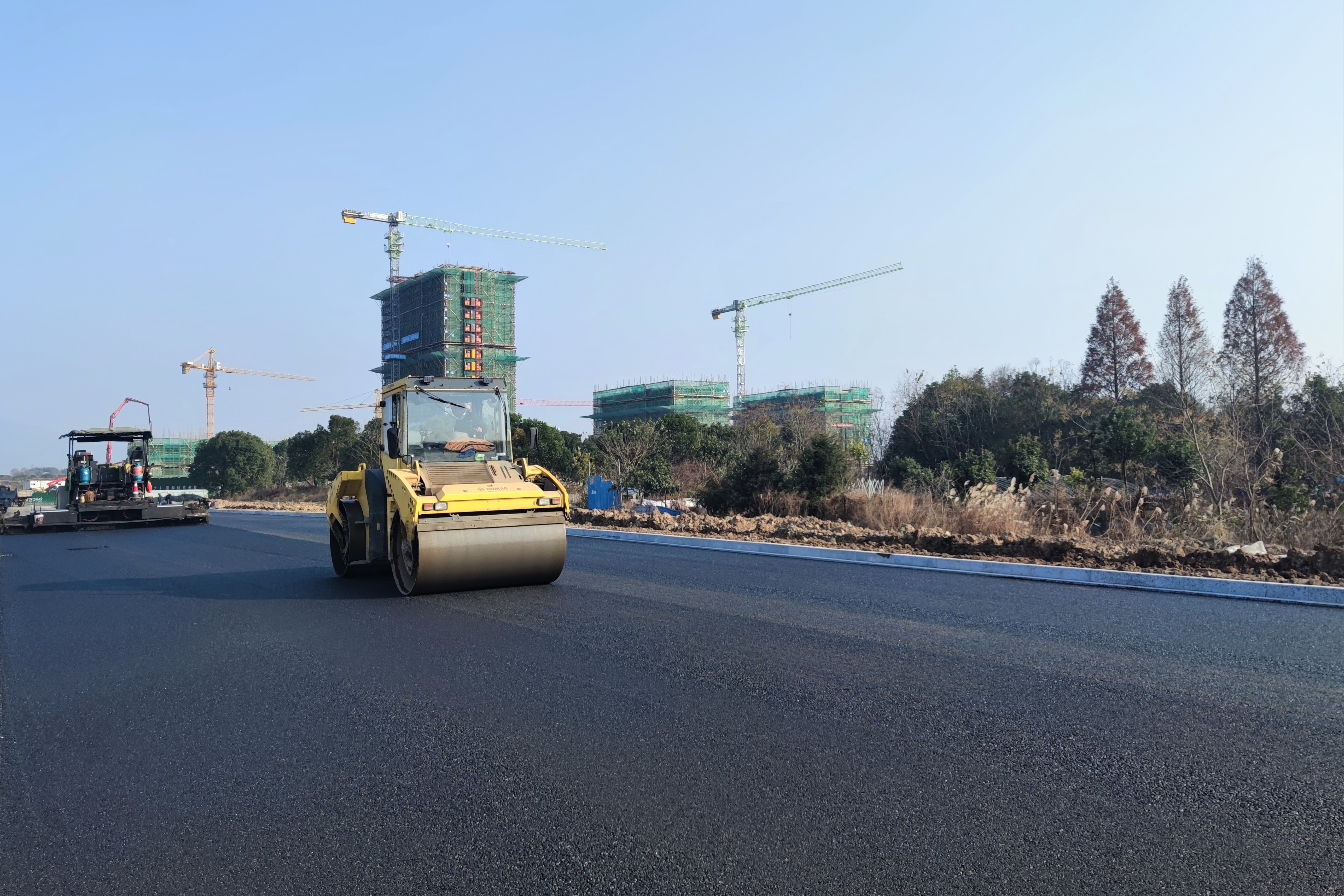 12月13日,嵊州EPC项目艇湖三路与艇湖二路开始首次沥青摊铺施工,标志着项目道路工程施工迈入新阶段。