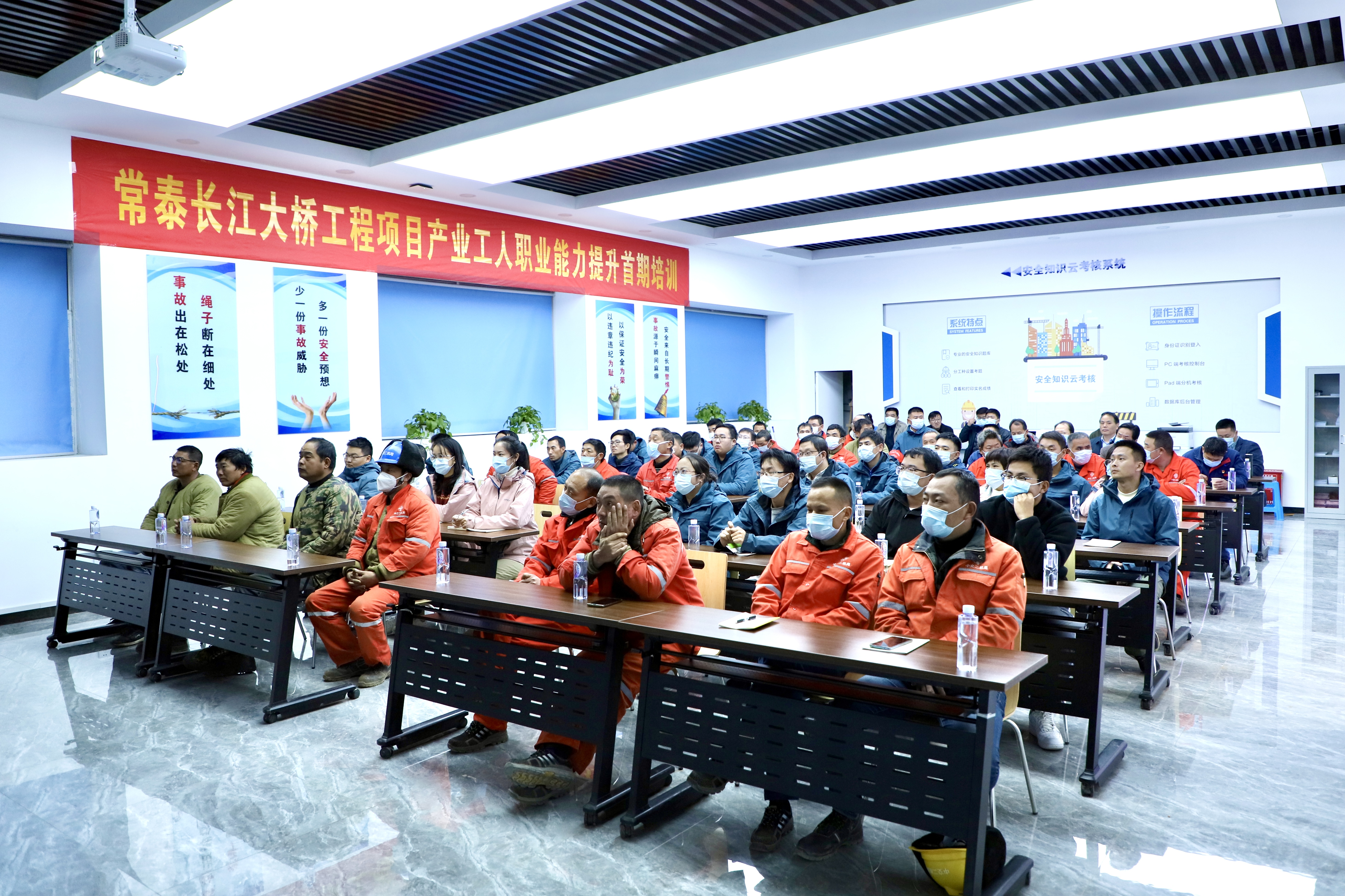 12月17日,常泰长江大桥首期产业工人职业能力提升培训在常泰项目产业工人培训中心成功开班。江苏省交通运输厅副厅长、党组成员汪祝君考察大桥项目建设情况之余,与一线工人一起全程旁听专家授课。