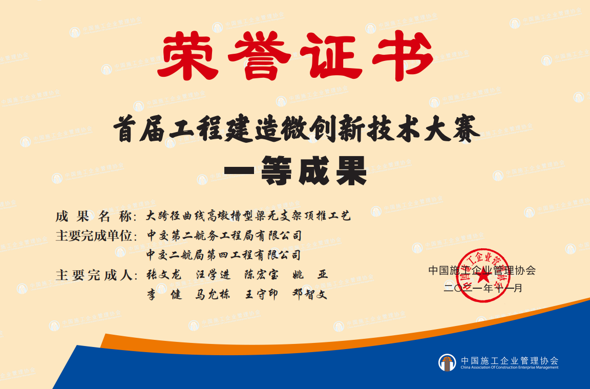 近日,中国施工企业管理协会举办的首届工程建造微创新技术大赛结果出炉。公司申报的“大跨径曲线高墩槽型梁无支架顶推工艺”在全国1210项微创新技术成果参赛中脱颖而出,经过初赛、复赛、决赛,最终获得大赛一等奖,也是二航局唯一一个一等成果奖。
