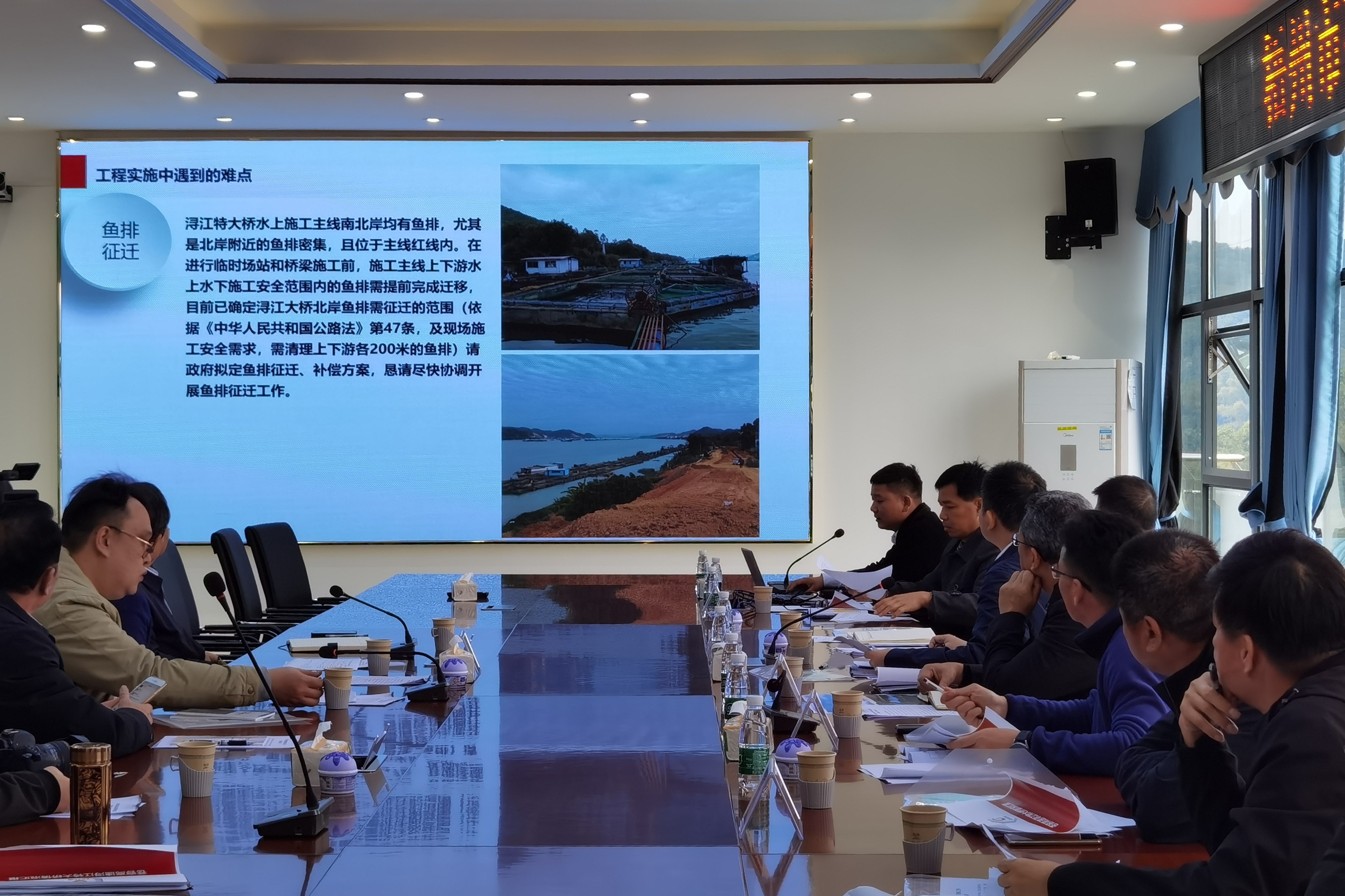 邓旭升一行深入现场调研,先后参观了浔江特大桥项目南、北岸红线区域,并乘坐交通船巡视了施工水域,杨琳对项目进展和实施情况进行了详细讲解。