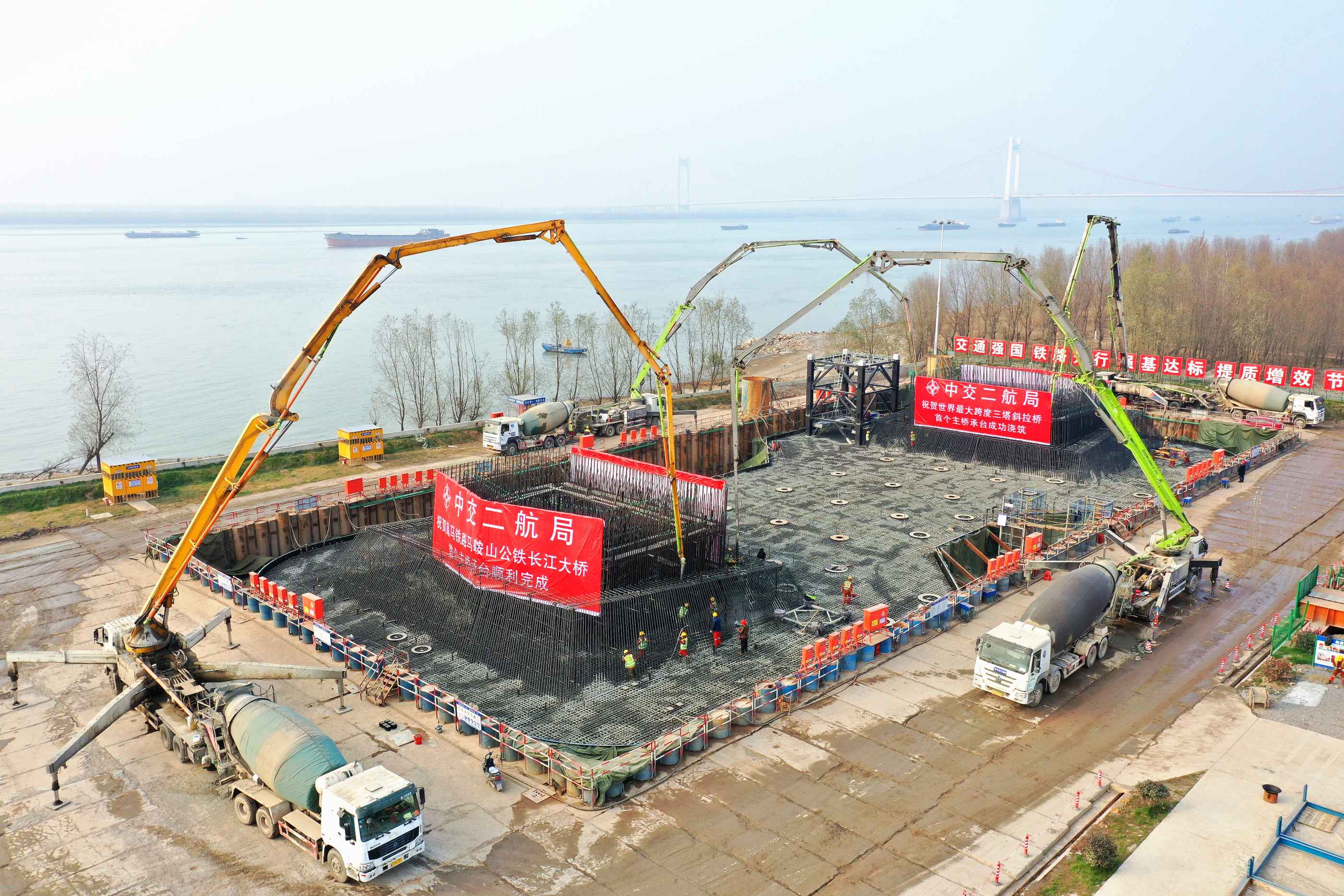 2022年1月2日,由公司承建的巢马铁路马鞍山公铁长江大桥南主塔顺利完成承台混凝土浇筑,标志着世界最大跨度三塔斜拉桥将转入塔柱施工阶段。