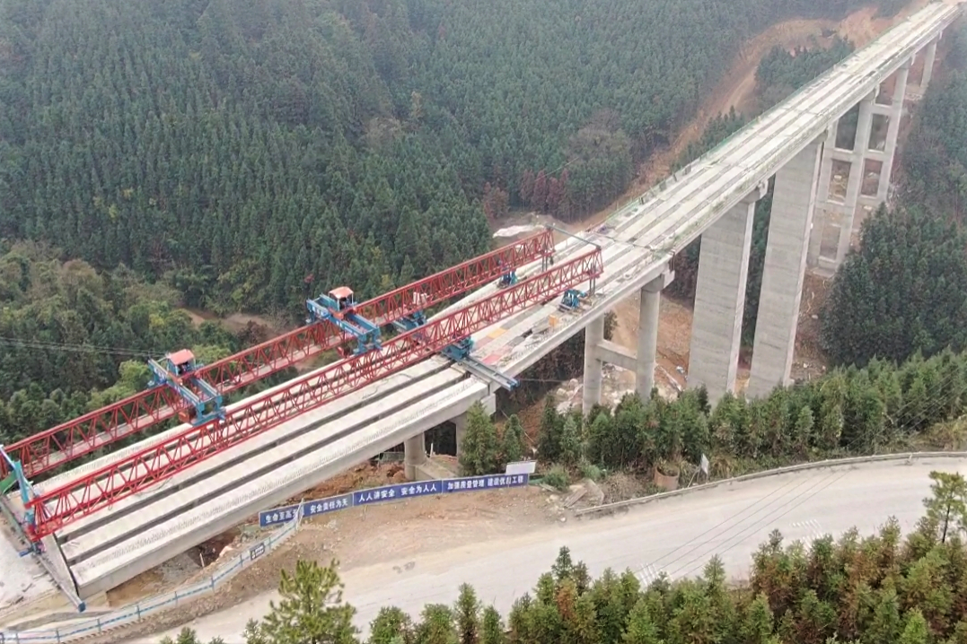 此次贯通的浮石一号高架大桥,全长248.24米,桥址位于柳州市融安县浮石镇浮石村岭脚屯西北约500米处,跨越山间的陡峭沟谷。上构采用4×30+4×30米装配式预应力混凝土简支T梁,共计34片。