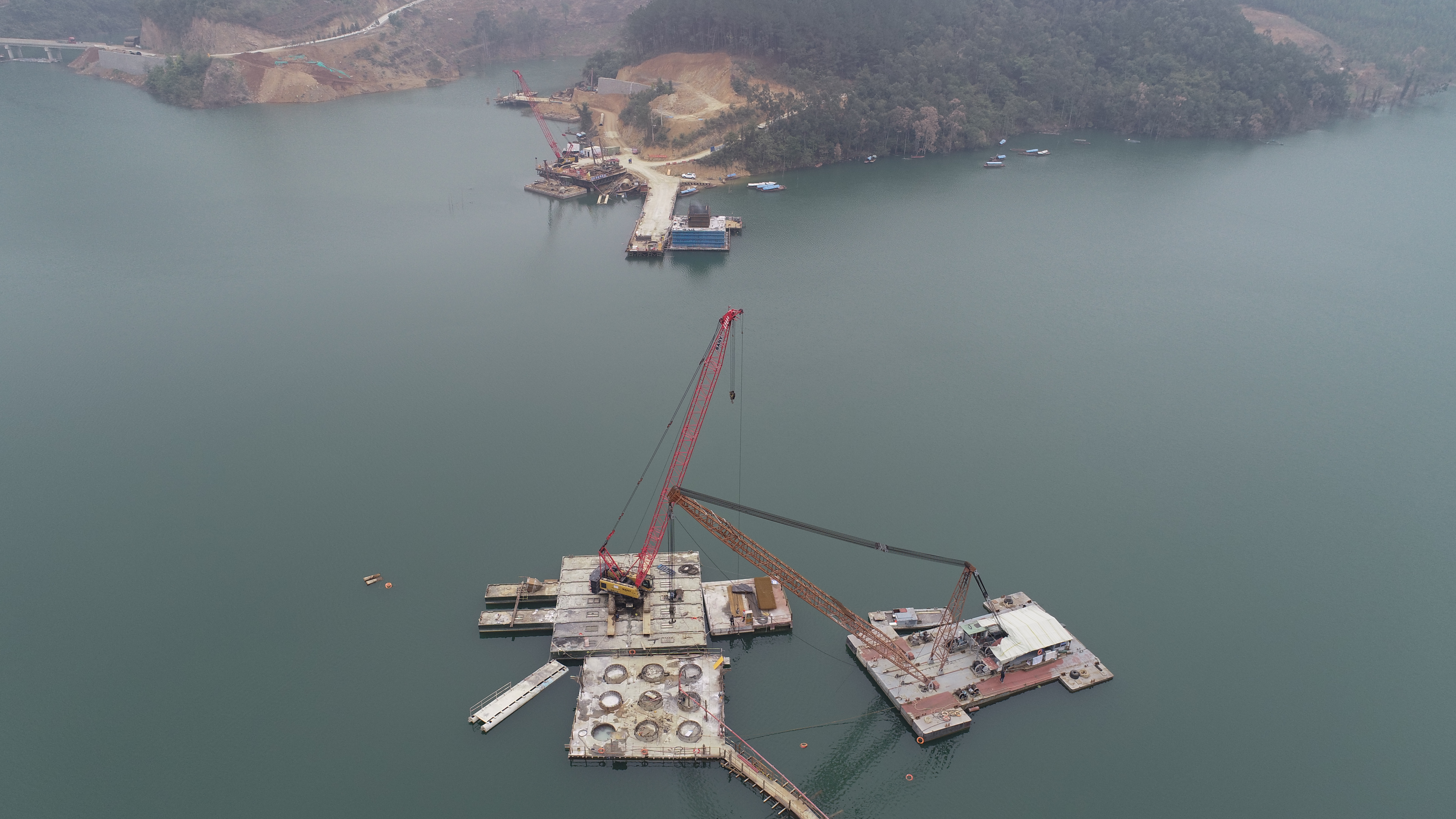 “2号主墩桩基无覆盖层,传统搭设固定式钢平台虽然不受水位的影响,但是我们没有大型水上设备,钢管桩的插打非常困难。”杨善宇说。“我们采用‘先浮-后固’的方式:用浮式平台下放角点钢护筒,再用钢护筒固定浮式平台,形成固定施工平台。远远看去,我们的平台像‘漂’在水库中央一样,其实稳定性非常好,而且承台底模板也预先安装完毕,后续施工非常安全、方便。”