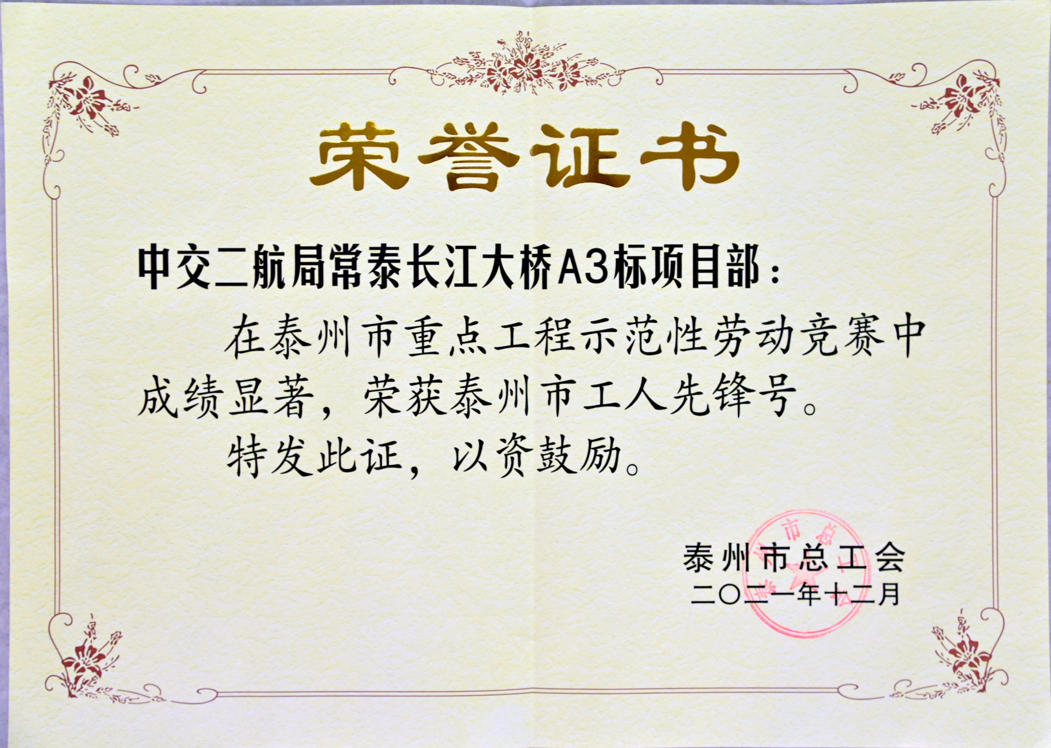 近期,常泰长江大桥项目部在泰州市重点工程示范性劳动竞赛中以优异的工程业绩、突出的精神风貌荣获“工人先锋号”荣誉称号。这是继2020年大桥5号墩沉井班组荣获“江苏省工人先锋号”后的又一集体荣誉。