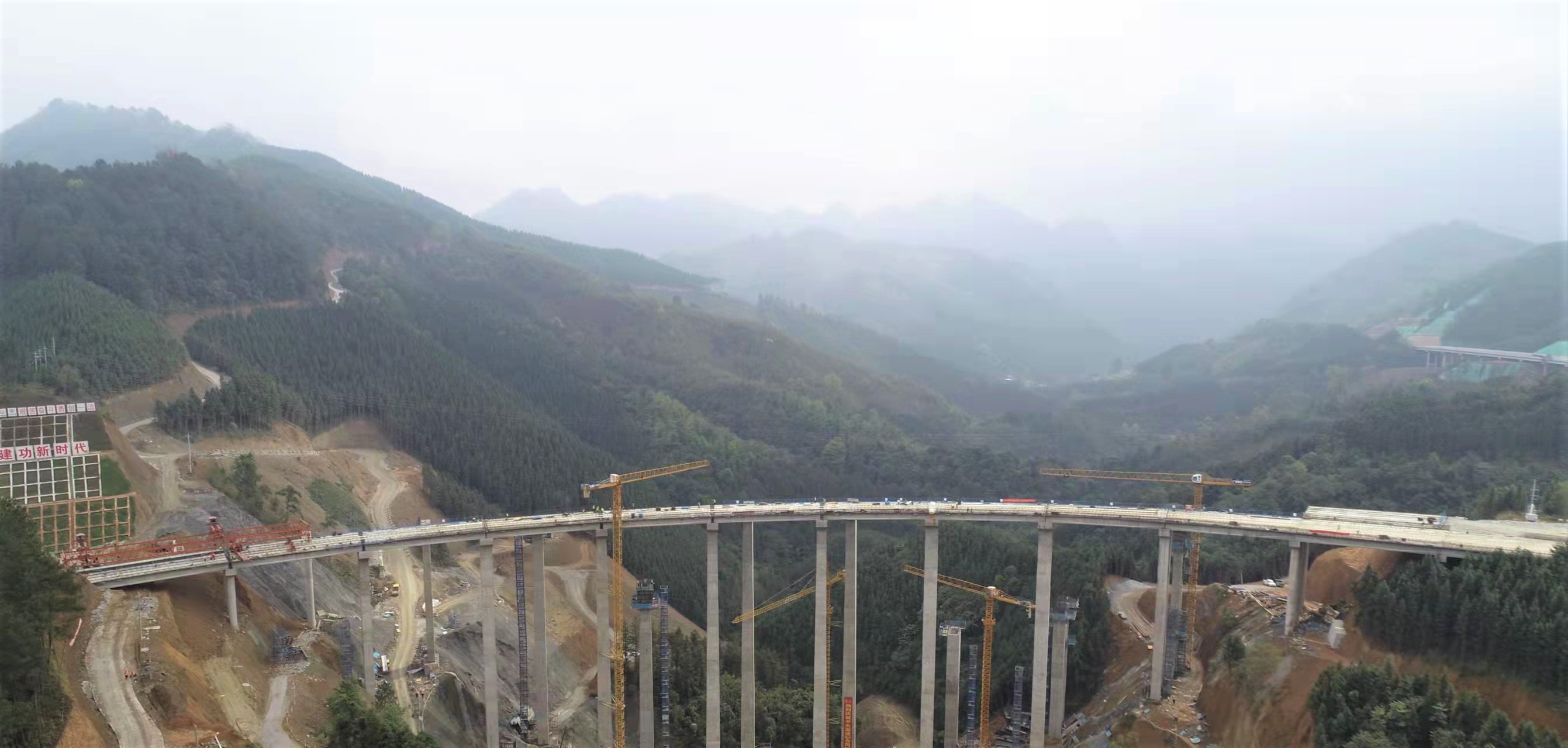平天高速起于黔桂省界南丹县月里镇,顺接贵州贵阳市乌当区,经平塘至天峨,是连接广西和贵州的重要交通干线。公司承建的4合同段主线长7.6公里,施工内容包括路基、桥涵、隧道、路面和交安等工程。其中,天峨枢纽互通是平天高速的关键控制性工程。此次贯通的天峨枢纽互通B匝道2号桥,全长369米,下部结构最高墩为91.6米,也是平天路最高墩。B匝道2号桥曲线半径较小,为250米,操作精度要求高,施工难度较大。项目部科学组织、精细管理,抓旱季、战雨季,克服疫情困扰,如期完成节点任务。