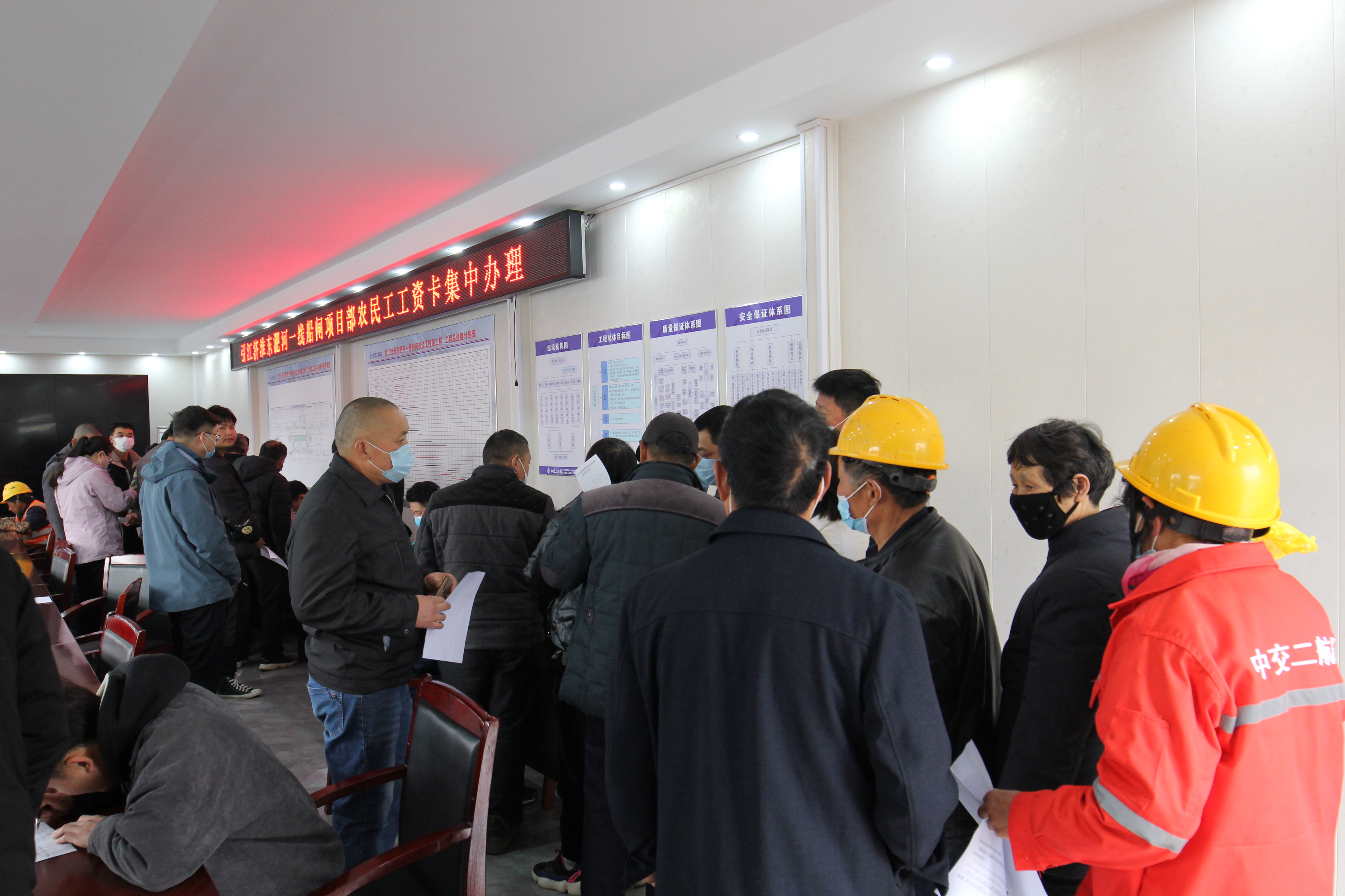 3月19日全天,引江济淮东淝河一线船闸改造项目部邀请当地徽商银行工作人员,集中为项目部的农民工办理个人工资账户和银行卡,做到农民工一人一卡,高度实行由专项账户为每位农民工朋友发放工资的管理方式。