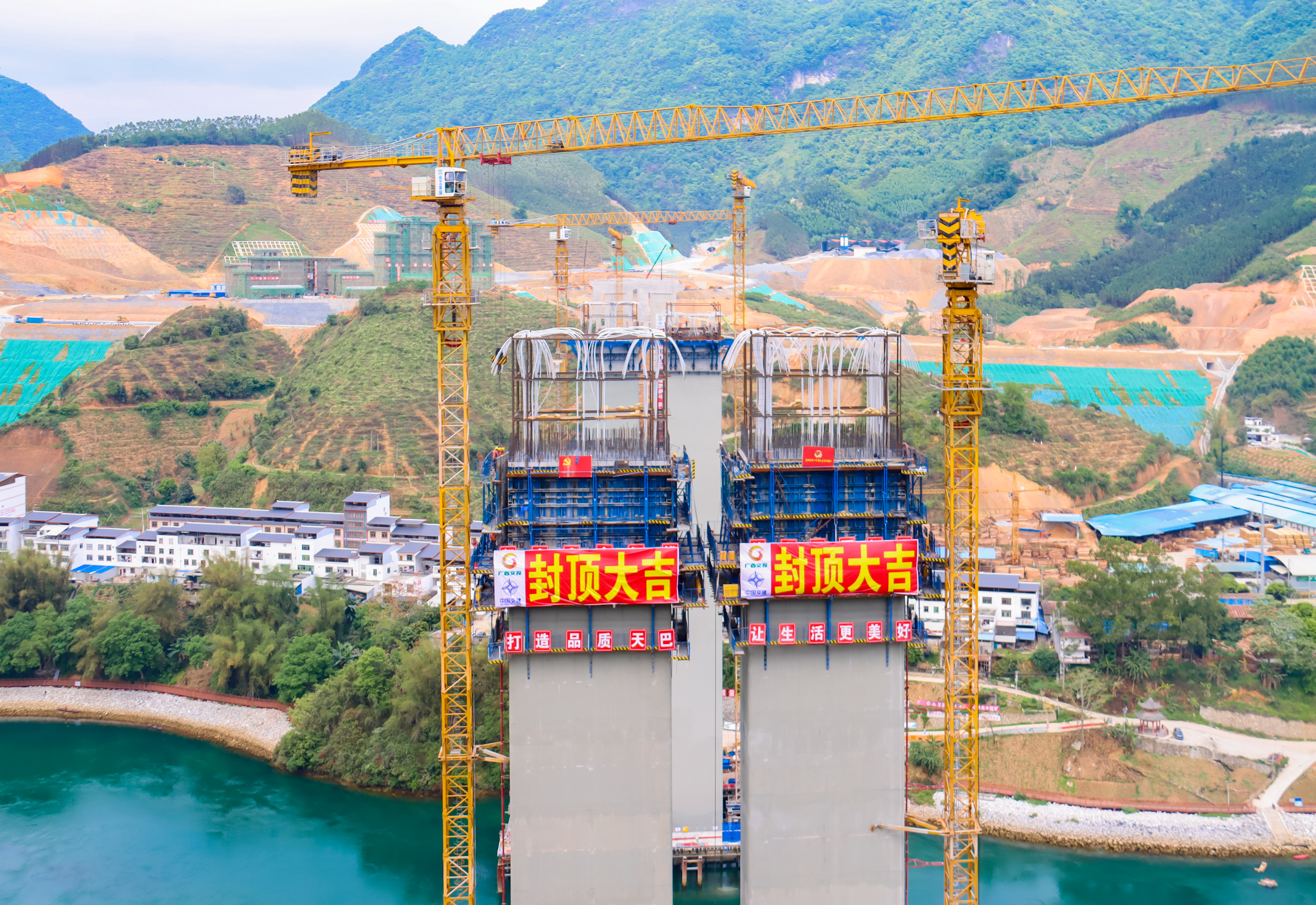 项目控制性工程--红水河特大桥是高速全线唯一一座跨越大型河流的桥梁,全长1099米,最大桥跨198米,总投资3.8亿元,跨越珠江干流西江的上游,红水河。桥跨布置形式为预应力混凝土T梁加连续刚构桥,采用挂篮悬臂浇筑法施工,两个主墩墩身为单肢变截面空心墩。此次浇筑的15号主墩,为全桥最高墩,高109米,横桥向长11.5米,分18个节段施工。14号主墩已于3月23日封顶。
