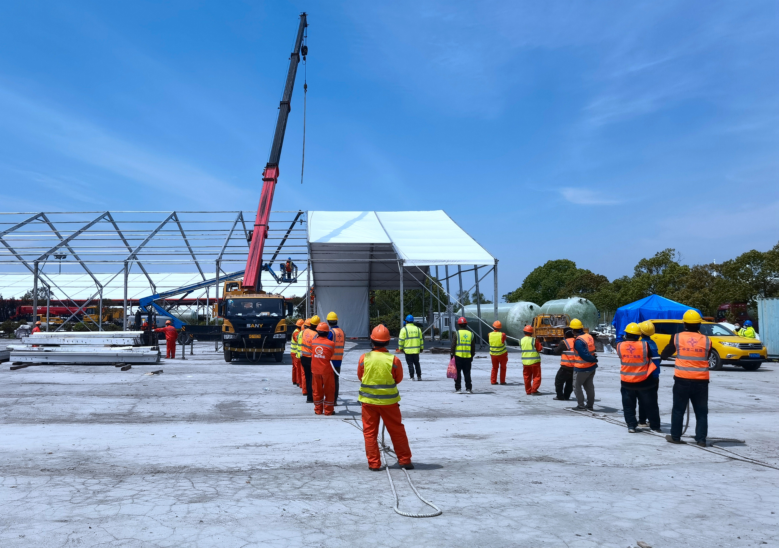 4月11日抵达嘉定区国际赛车场以来,27人的援建队伍不舍昼夜、不畏风雨、驰而不息,历时137小时,时常连续工作18小时以上,期间不乏雨天、夜天作业。队伍累计整平地面6000平方米,搭建、加固、整修围挡4000米,同时协助铺架方舱顶棚5400平方米,布设电缆1000米。