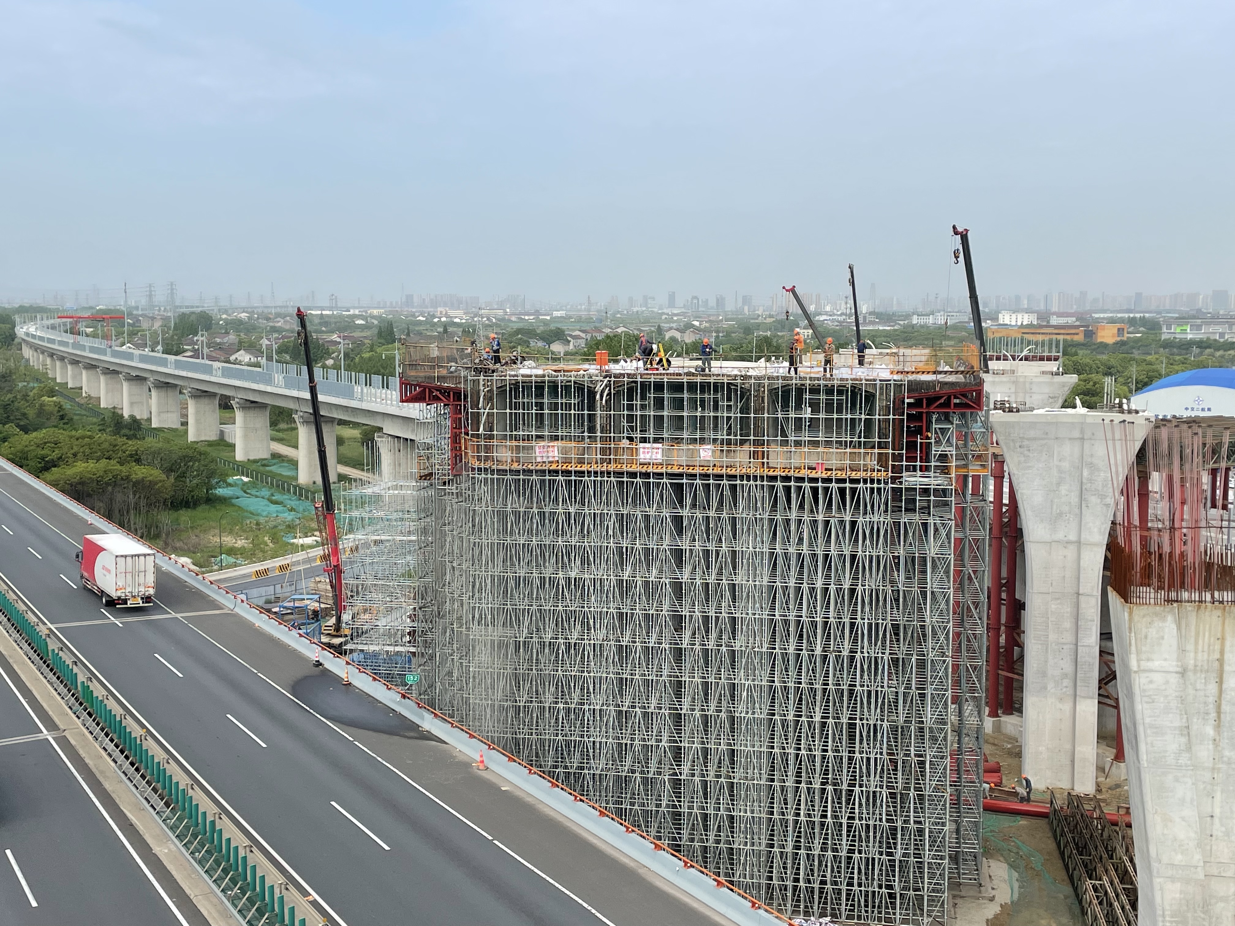 4月27日,历时6小时,南沿江铁路与国道G312长虹东路交叉段同步工程主线桥跨沪武高速连续梁3号主墩0号块浇筑完成。至此,项目最大的两个主墩0号块施工任务全部完成。