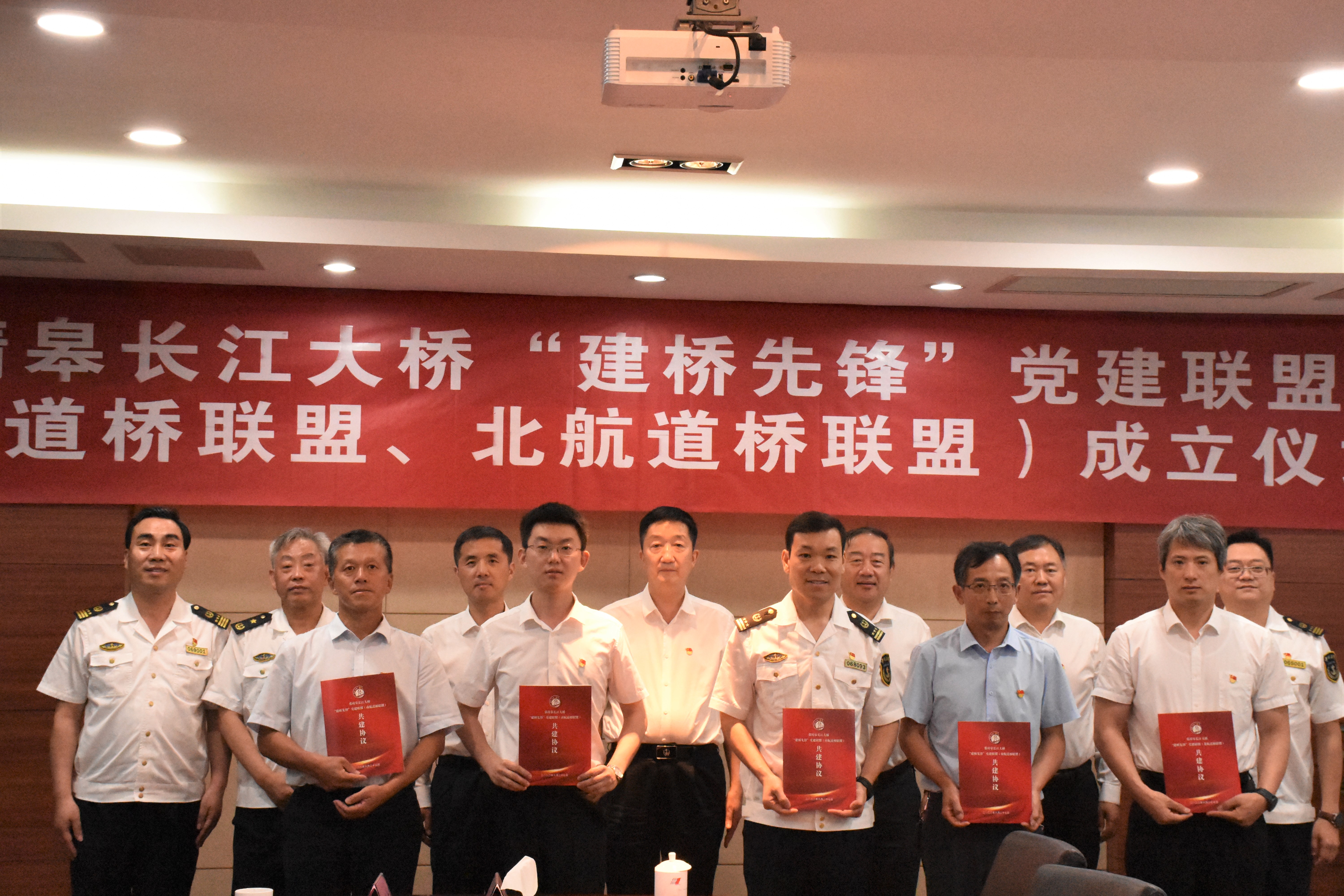 6月27日,张靖皋长江大桥建桥“先锋”党建联盟成立仪式在张家港市举行,吹响了党建引领促发展、业务融合增动能、争当桥区水域平安卫士的号角。张家港、南通、泰州三地海事部门,携手张靖皋长江大桥建设指挥部及中交二航局等相关建设施工单位,共14家单位基层党组织齐聚江苏张家港,共同举行张靖皋长江大桥“建桥先锋”党建联盟成立仪式,签署共建协议。江苏海事局党组书记、局长朱汝明,江苏省交通工程建设局党组书记、局长蒋振雄,江苏海事局党组成员、副局长徐伟,各单位相关负责人出席仪式。