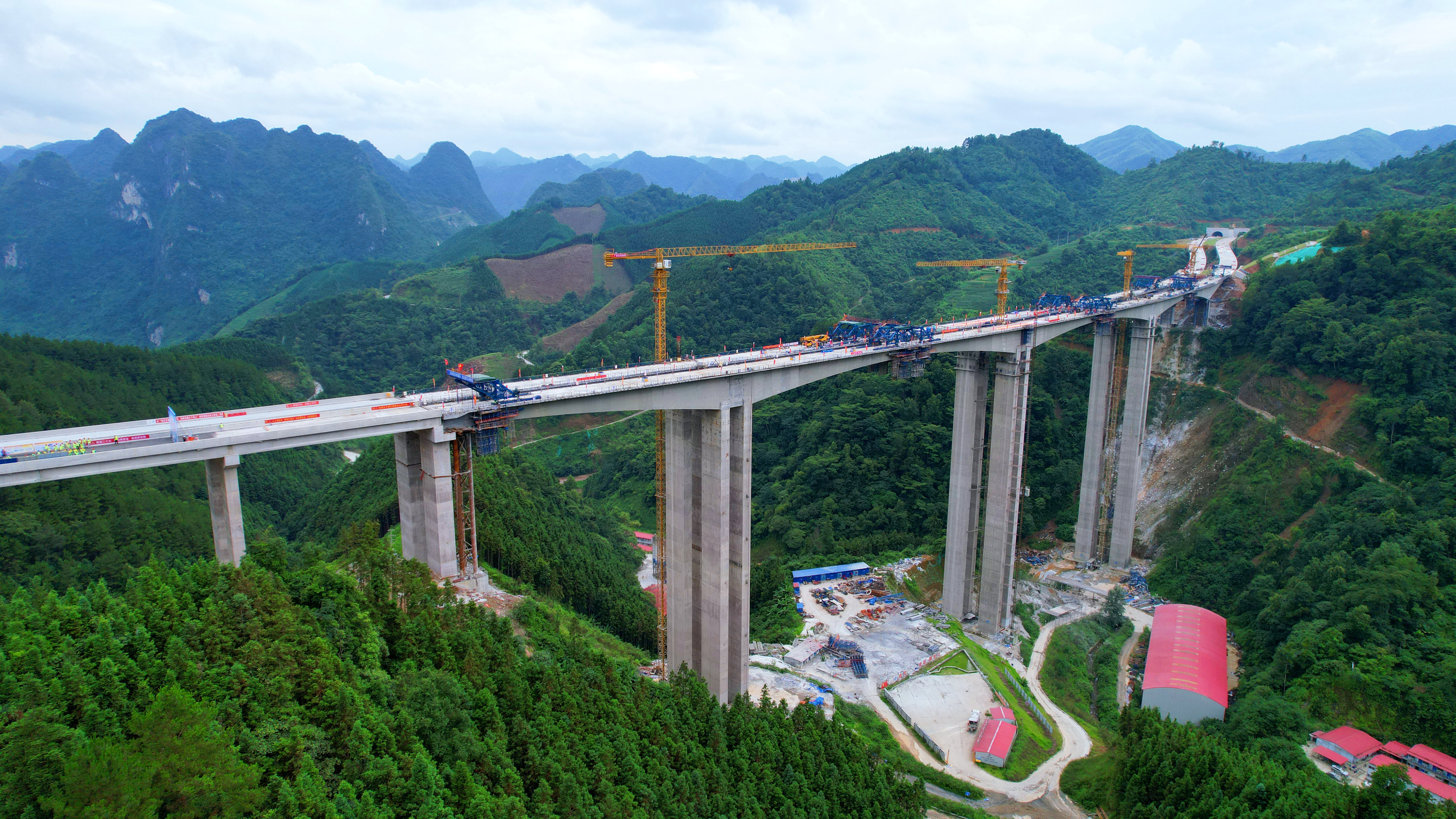 南丹至天峨下老高速公路主线全长104.9公里,是拥有最长广西单座公路隧道和世界在建最大跨径拱桥的项目。此次贯通的登里1号高架特大桥是南天高速项目的控制性工程,位于广西河池市天峨县登里村,全长1064.1米,最高墩高131米,主桥为5跨连续刚构桥,最大单跨150米,是广西最高连续刚构桥。