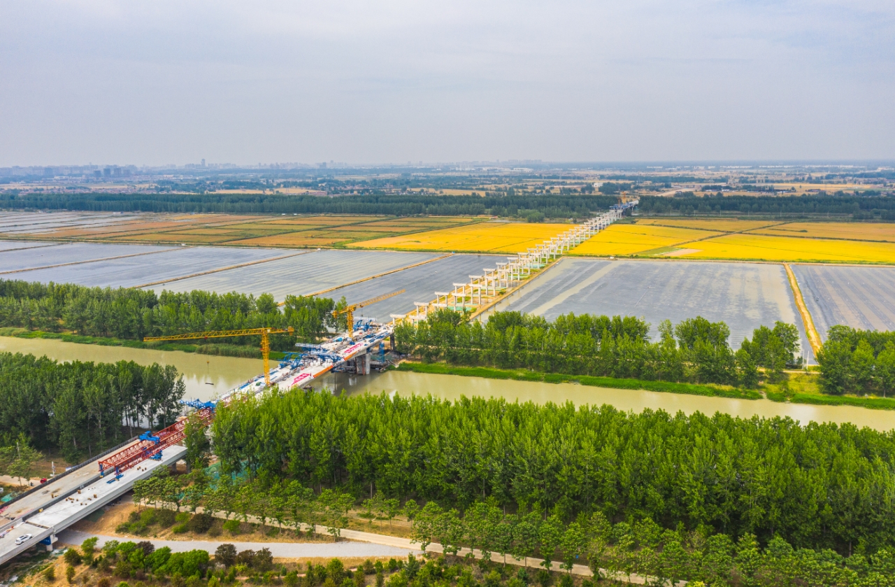 站在宿连高速公路宿豫至沭阳段节点性工程——淮沭新河特大桥制高点向东眺望,烈日下,54排长近1公里的白色墩柱两两并排而立,蔚然壮观。