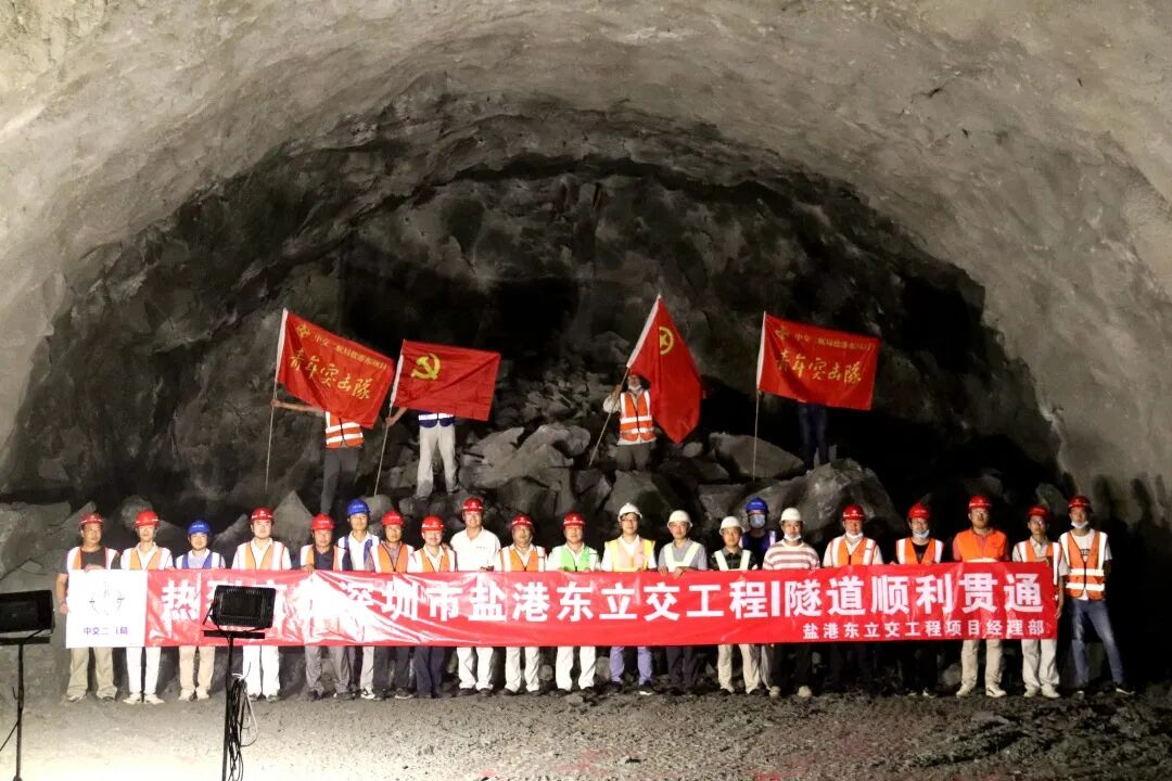 盐港东立交位于深圳市盐田港东港区北面,北接坪盐通道,东接盐坝高速及东港区,西接盐龙大道,为5路交叉的大型枢纽立交。项目新建匝道10条,包括桥梁16座,隧道5条,桥隧比81%,其中此次贯通的I隧道全长616.371米,洞身主要为Ⅱ、Ⅲ、Ⅳ、Ⅴ级围岩,以全风化~中风化花岗岩为主,进洞浅埋段岩体破碎,裂隙发育,围岩无自稳能力,易坍塌、掉块。