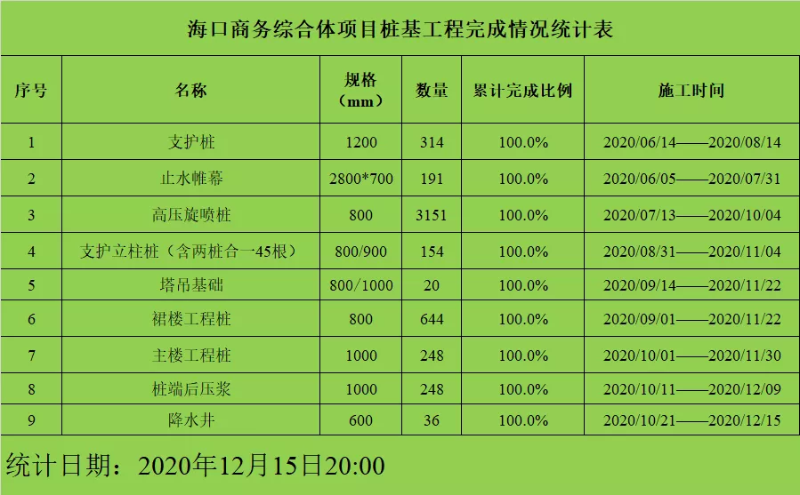 在施工过程中,由于支护和桩基工程施工内容多,项目工程部制定了一张特别的表格,在表格中清晰体现了各分项工程每日完成产量和累计完成比例,并安排专人在每天晚上20:00之前在项目微信群中发布,工程进度一目了然。