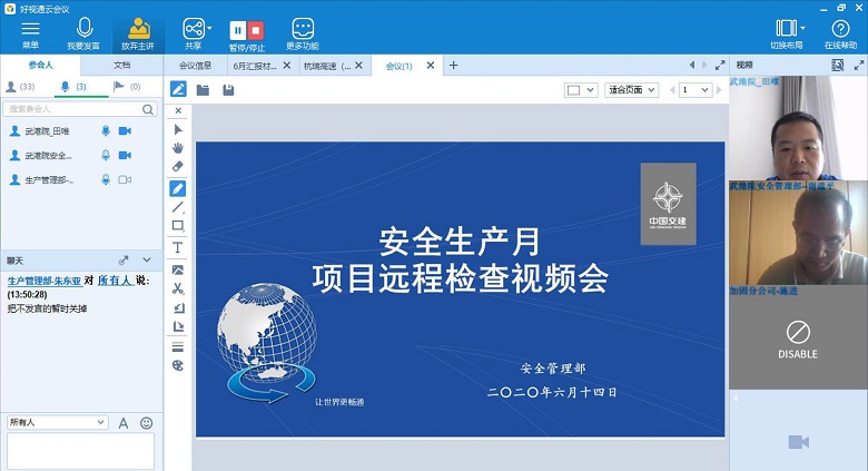 根据《中交武港院2020年“安全生产月”活动方案》的总体安排,结合前三次项目远程检查情况,6月14日,武港院(以下简称“公司”)组织召开“安全生产月”项目远程检查视频会。公司副总经理田唯,生产管理部、安全管理部全体成员及受检单位安全分管领导、项目部相关人员共计33人次参加了会议。